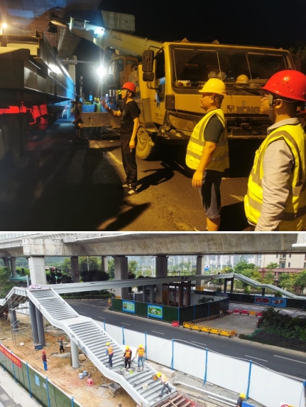 由于人行天橋項(xiàng)目建設(shè)所處的位置地下含高壓線等管線,施工環(huán)境較為復(fù)雜,且又處在交通通行量大的東環(huán)高速高架橋下,由于空間受限,鋼箱梁吊裝與高架橋最近的距離僅有5公分,吊裝難度極大。為此,我們采取雙吊車協(xié)同施工、錯(cuò)峰施工和夜間施工的辦法。為確保施工安全,市政集團(tuán)從上至下高度重視,由集團(tuán)領(lǐng)導(dǎo)帶隊(duì),項(xiàng)目總工及各職能部門主要人員齊上陣,從交通協(xié)調(diào),運(yùn)梁車跟隨指導(dǎo),安全措施落實(shí)及現(xiàn)場(chǎng)架梁的線位等多方面進(jìn)行把控,主要負(fù)責(zé)人靠前指揮,帶領(lǐng)黨員干部及時(shí)協(xié)調(diào)解決吊裝過(guò)程中遇到的問(wèn)題,充分發(fā)揮出黨支部戰(zhàn)斗堡壘和黨員的模范帶頭作用。