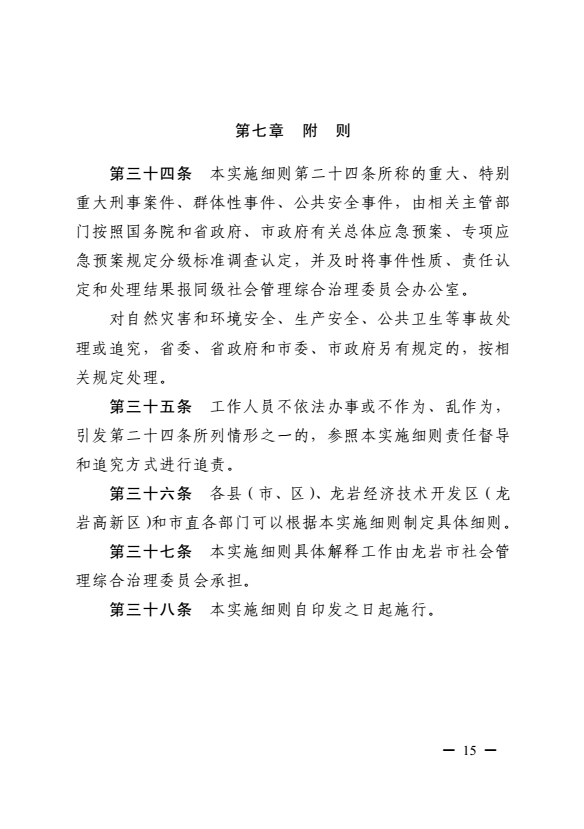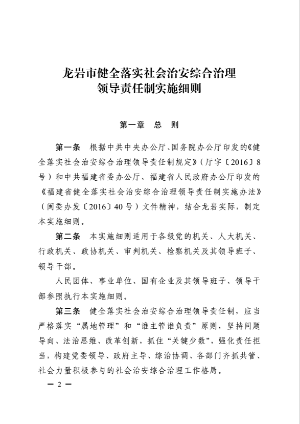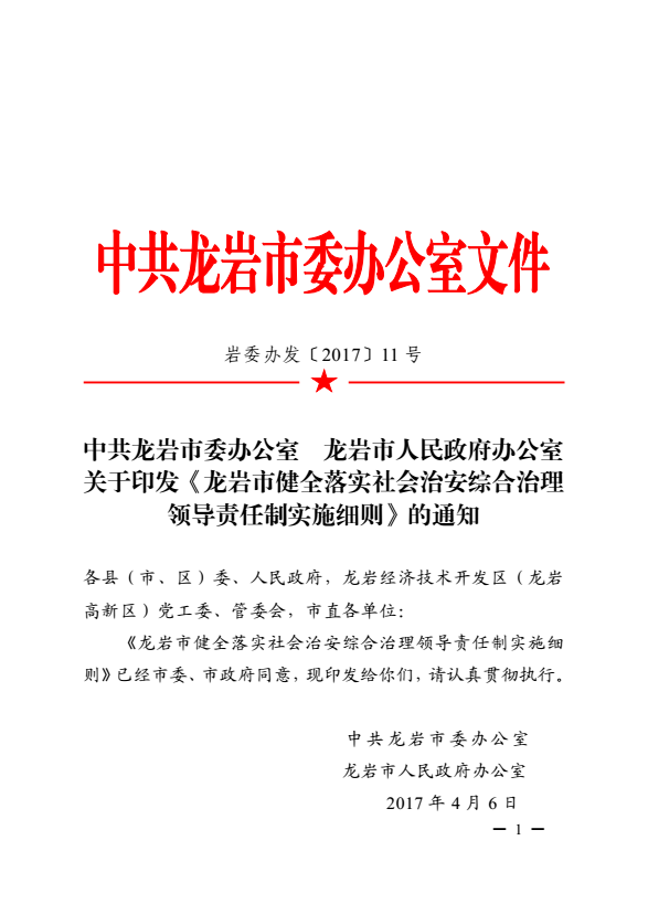 龍巖市健全落實社會治安綜合治理領(lǐng)導(dǎo)責(zé)任制實施細(xì)則(巖委辦發(fā)【2017】11號)