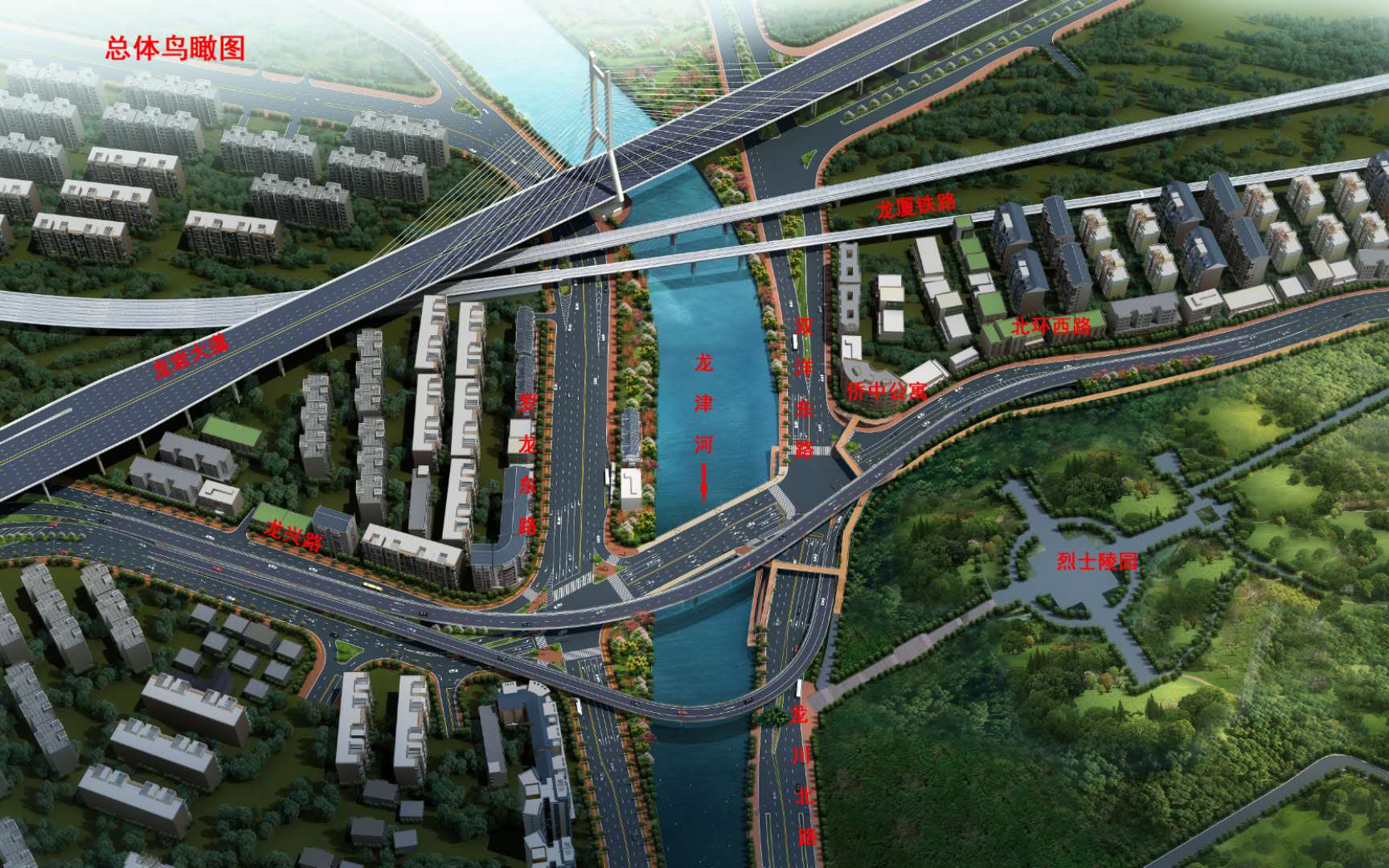 沿北環(huán)西路、龍興路設(shè)置南北分離式雙向四車道高架,南側(cè)接龍興路,北側(cè)接現(xiàn)狀北環(huán)西路,高架靠東側(cè)布置(緊貼烈士陵園),橋梁總長(zhǎng)約1140米,凈寬約7.7米;在雙洋路、龍川北路、北環(huán)西路設(shè)置人行天橋,與山體步道銜接,以完善慢行系統(tǒng);在烈士陵園山體下采用明挖回填方式設(shè)置框涵,長(zhǎng)度約225米,凈寬10.75米。