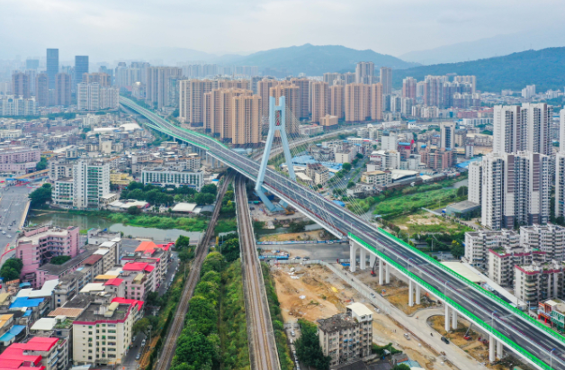 羅橋節(jié)點改造提升工程2019年11月開工建設,2021年8月建成通車。該項目沿北環(huán)西路、龍興路設置南北分離式雙向四車道高架,南側接龍興路,北側接現(xiàn)狀北環(huán)西路,高架靠東側布置(緊貼烈士陵園),橋梁總長約1140米,凈寬約7.7米;在雙洋路、龍川北路、北環(huán)西路設置人行天橋,與山體步道銜接,以完善慢行系統(tǒng);在烈士陵園山體下采用明挖回填方式設置框涵,長度約225米,凈寬10.75米工程投資1.4億元。